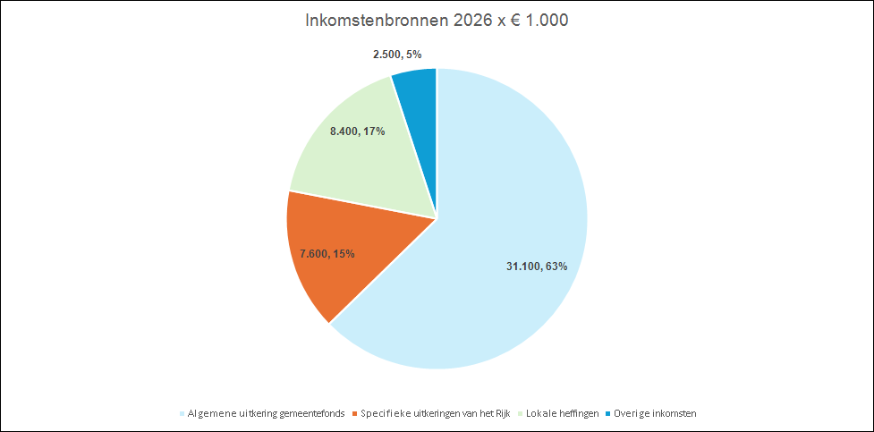 De algemene uitkering uit het gemeentefonds vormt verreweg het grootste deel van onze inkomsten. In 2026 gaat het hierbij om € 31,1 miljoen, oftewel 63% van de totale inkomsten. Dit betekent dus dat de financiële positie van de gemeente sterk afhankelijk is van het gemeentefonds.