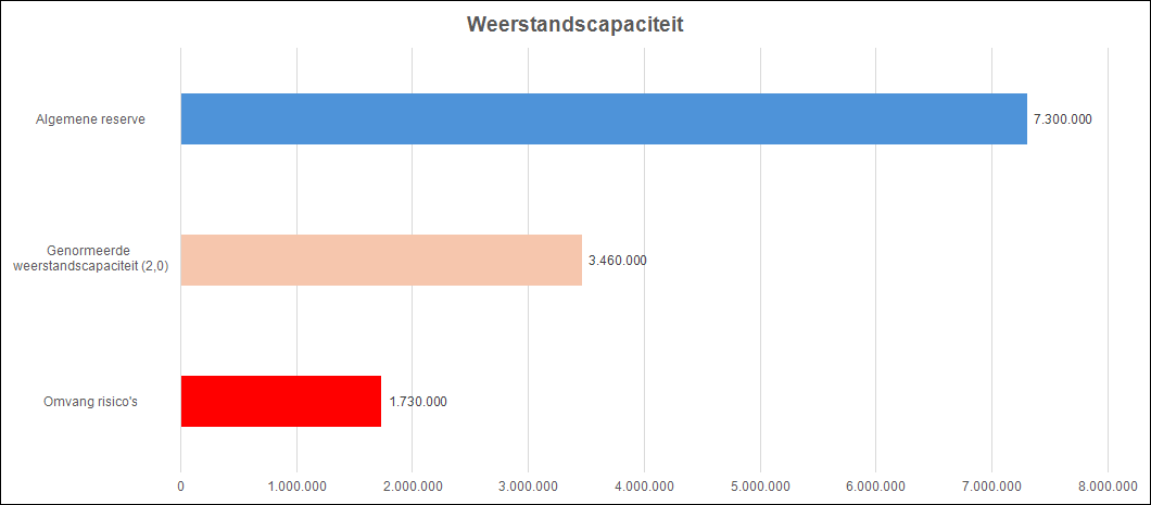 Terug naar navigatie - 4. Financiële context en aandachtspunten - WeerstandsvermogenHet weerstandsvermogen geeft aan in hoeverre de gemeente in staat is de negatieve significante financiële gevolgen van risico’s af te dekken met eigen weerstandscapaciteit en is een belangrijke indicator voor de financiële robuustheid van de gemeente. De weerstandscapaciteit bestaat uit de omvang van de algemene reserve en de post onvoorzien. De weerstandsratio geeft de verhouding weer tussen de aanwezige weerstandscapaciteit en de omvang van de risico's. Voor deze ratio heeft de gemeenteraad een minimum norm vastgesteld van 2,0. Dit betekent dat de omvang van de weerstanscapaciteit een minimale omvang moet hebben van 2 x de omvang van de risico's. De actuele weerstandsratio is 4,4 en kan als uitstekend worden gekwalificeerd. De omvang van de weerstandscapaciteit welke op dit moment niet nodig is om te kunnen voldoen aan de minimumnorm van 2,0 is ruim € 3,8 miljoen (eenmalig) en kan dus in principe voor andere doeleinden worden ingezet.