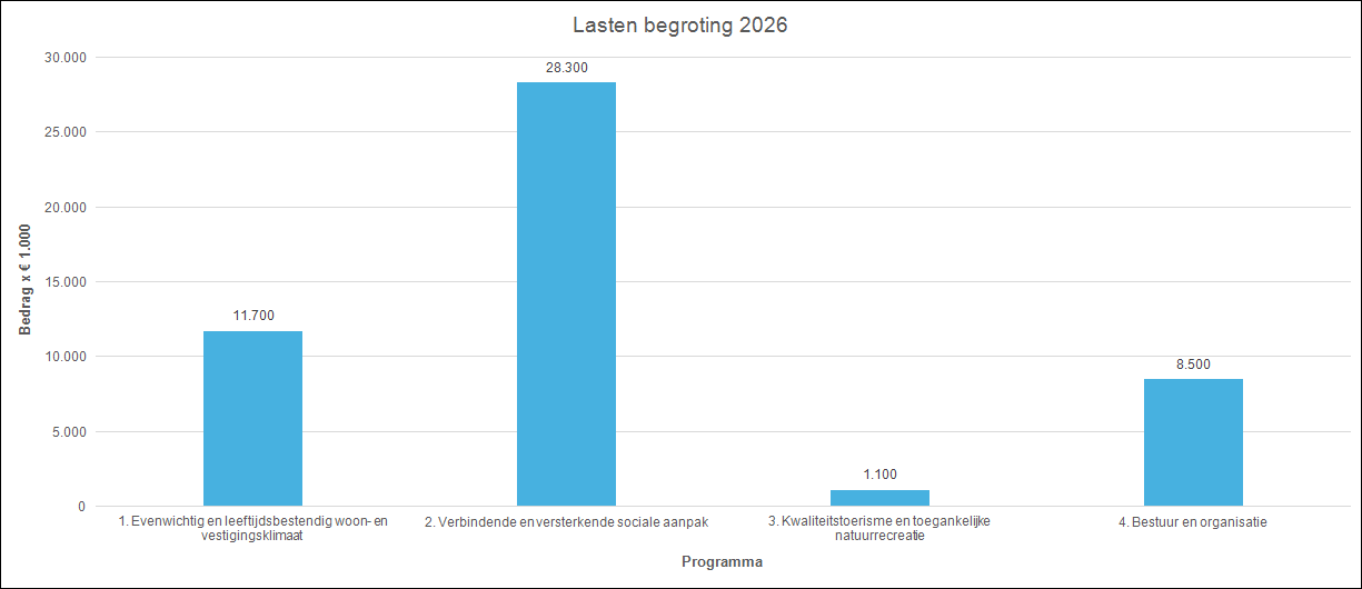 Terug naar navigatie - 4. Financiële context en aandachtspunten - Begroting 2026De begroting 2026 (zie ook https://doesburg.begrotingsapp.nl/programmabegroting-2026-2029) van de gemeente Doesburg heeft een omvang van ruim € 49 miljoen. Een groot deel hiervan (grofweg 80%) draagt een wettelijk verplicht karakter en is beperkt beïnvloedbaar. Het gaat hierbij dan bijvoorbeeld om de Wmo, de jeugdzorg en de verstrekking van algemene bijstandsuitkeringen in het kader van de participatiewet. Ongeveer 20% van de begrote uitgaven heeft een autonoom karakter. Voorbeelden hiervan zijn het zwembad (subsidie) en het jongerencentrum.